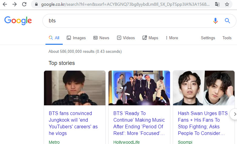 미국구글에서 BTS를 검색했더니 검색결과는 약 5억 8천6백만 건이다.